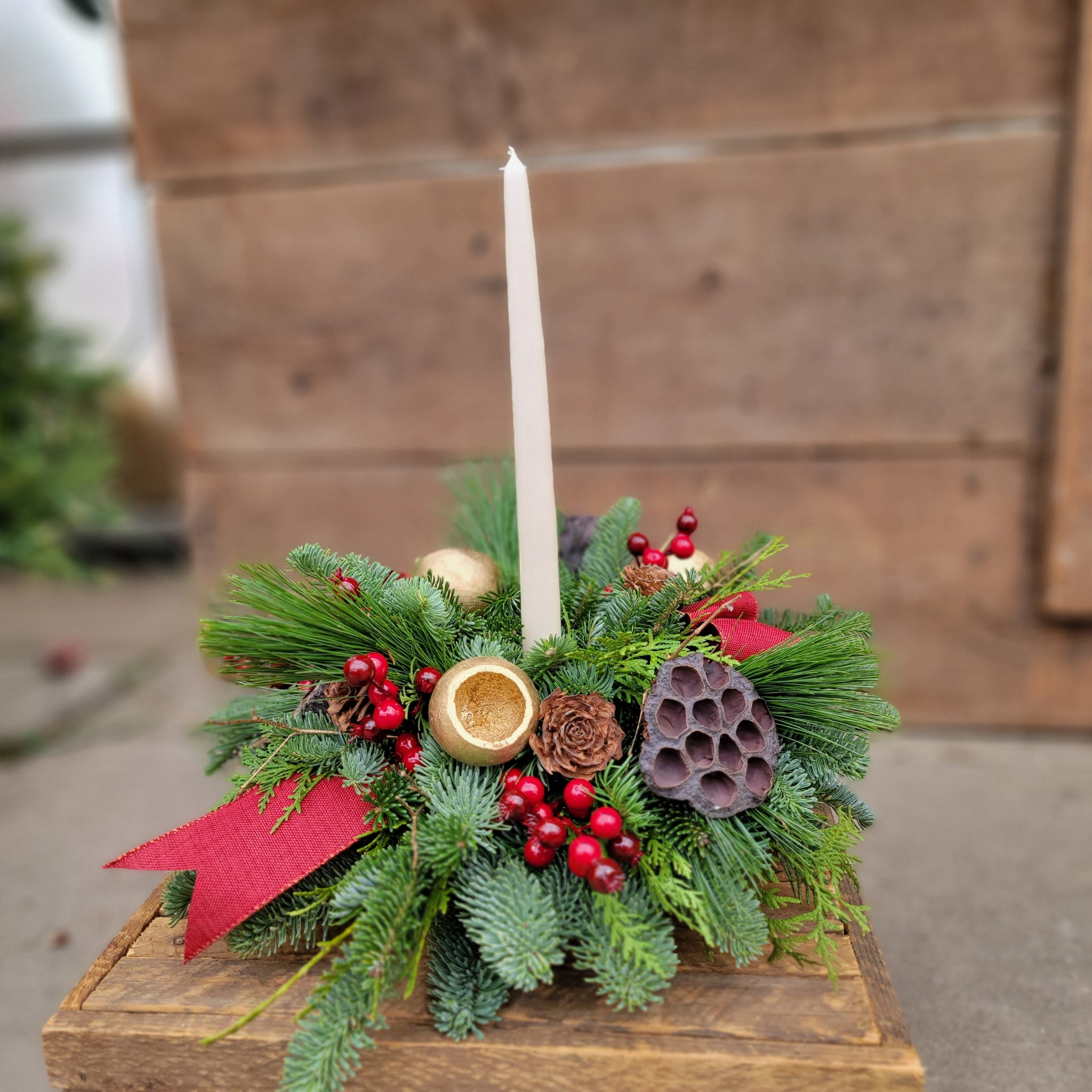 This festive indoor centerpiece of fresh greens, ribbons, bows and berries will dress up any holiday table. The workshop cost includes all materials, but please bring gloves to protect your hands. Limited to the first 30 prepaid guests.