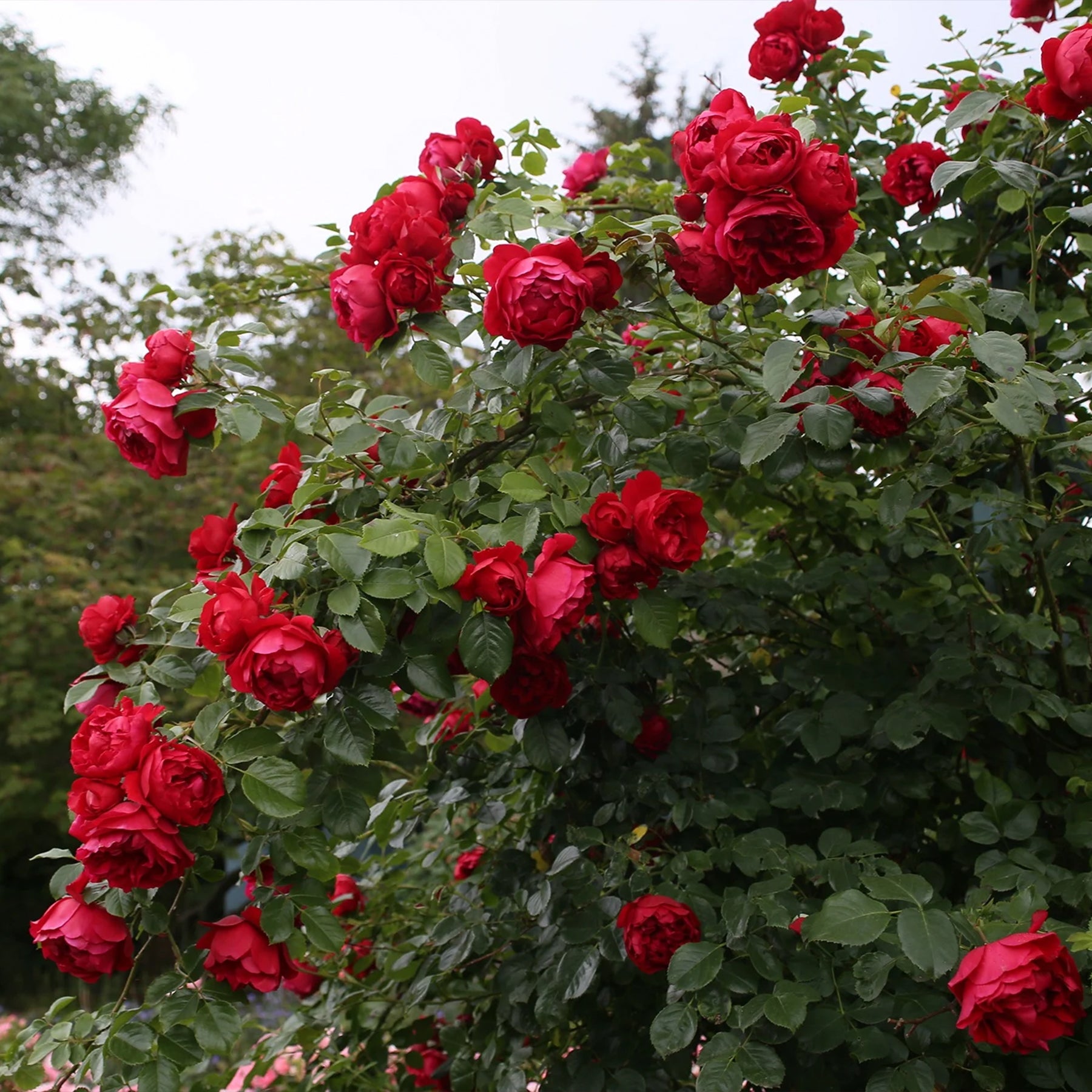 A very robust and winter-hardy Climber with nostalgic, quartered, bright-red flowers in clusters. This Climber blooms throughout the season. Foliage is dark, glossy and disease resistant. Compact in size but a terrific impact on any fence or wall.